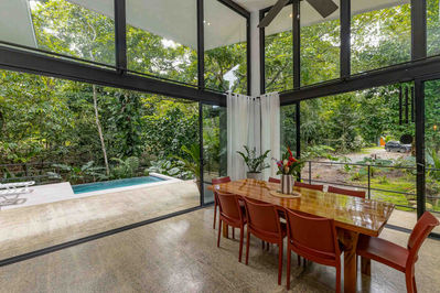 The expansive wrap-around terrace is designed for year-round outdoor living. From here, enjoy direct access to a refreshing swimming pool with panoramic views of the creek and lush jungle. Whether relaxing with a morning coffee or entertaining guests at sunset, this space is pure Costa Rican magic.